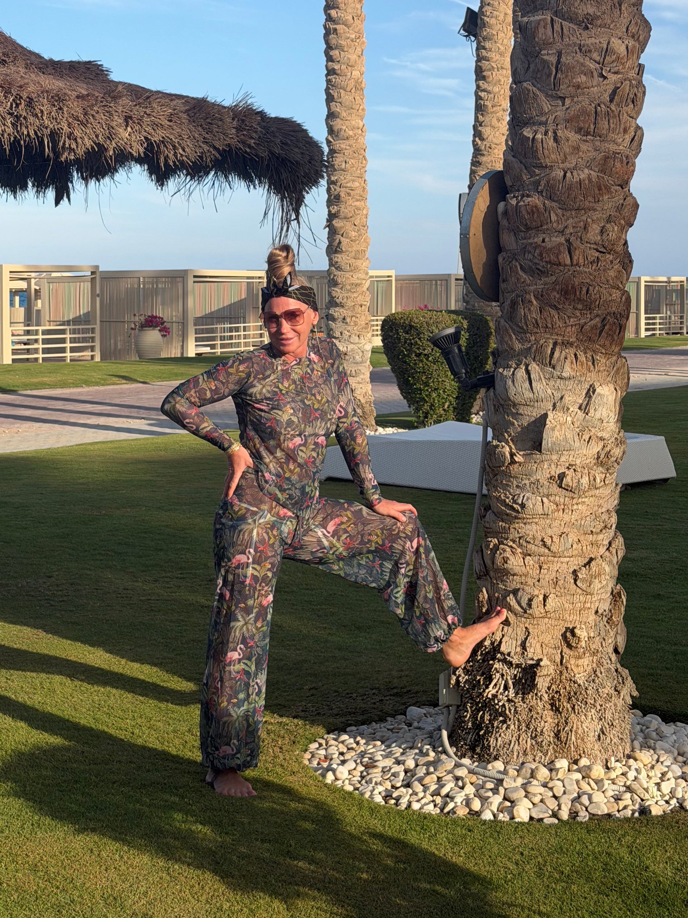Smarttan läbipäevituvad pikad püksid oleme õmmelnud imeõhukesest venivast materjalist. Selline kangas ASENDAB PÄIKESEKAITSEKREEMI ja sellega saab mõnusasti ja turvaliselt päevitada nii tänaval jalutades, sportides kui ka rannas peesitades. Pükstega on mugav ka ujuda ja need kuivavad pärast vees käimist mõne minutiga. Valides pükste juurde sama mustriga pikkade käistega pluusi, saate kena, kogu keha katva komplekti.