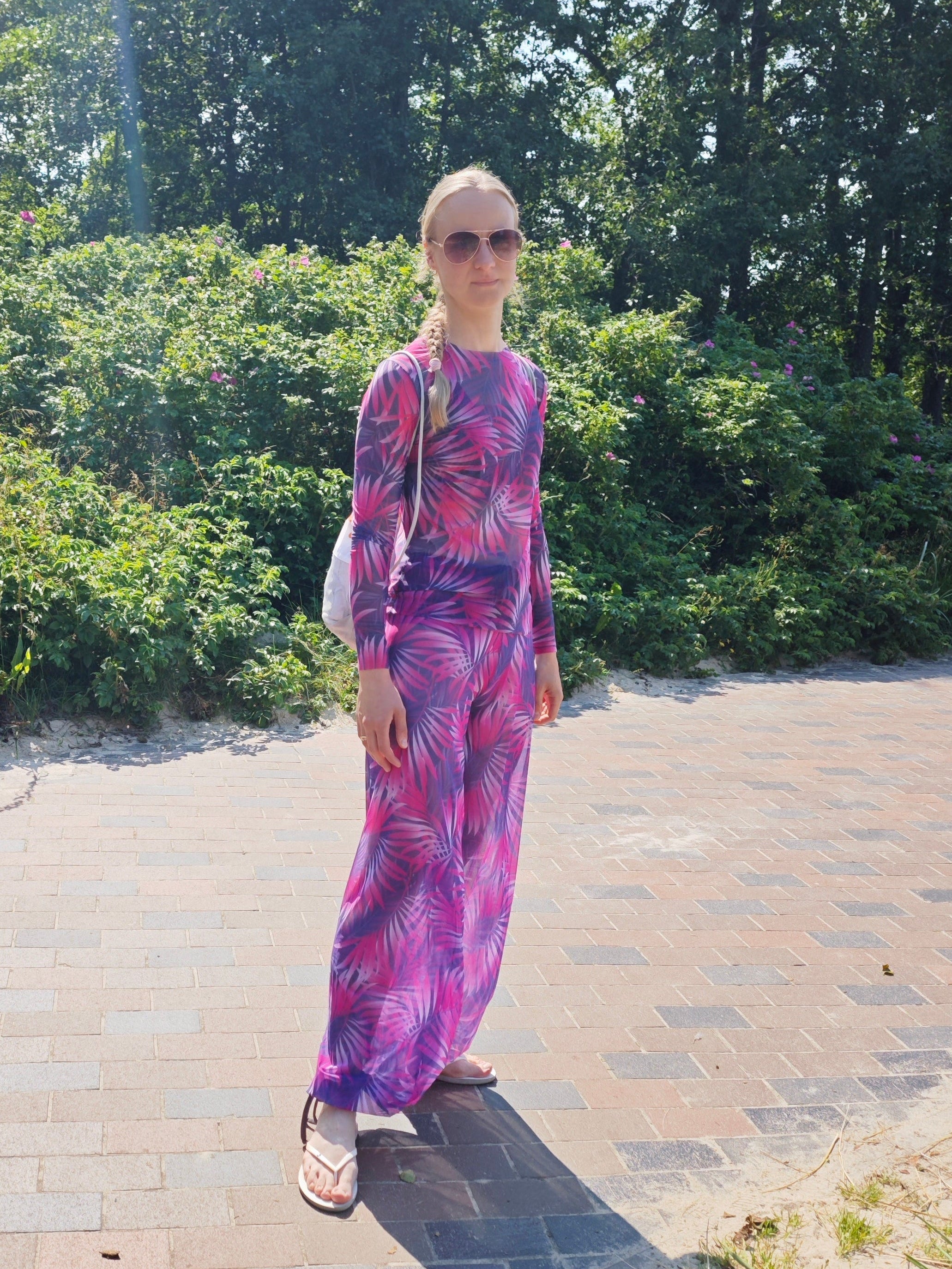 Smarttan läbipäevituvad pikad püksid oleme õmmelnud imeõhukesest venivast materjalist. Selline kangas ASENDAB PÄIKESEKAITSEKREEMI ja sellega saab mõnusasti ja turvaliselt päevitada nii tänaval jalutades, sportides kui ka rannas peesitades. Pükstega on mugav ka ujuda ja need kuivavad pärast vees käimist mõne minutiga. Valides pükste juurde sama mustriga pikkade käistega pluusi, saate kena, kogu keha katva komplekti.
