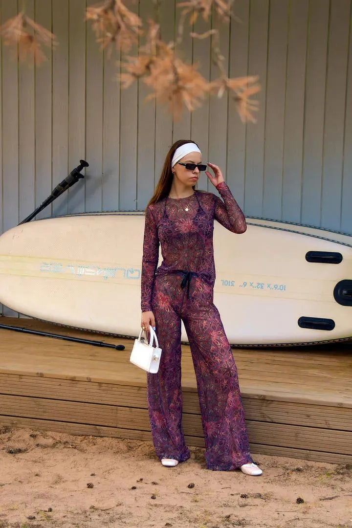 Smarttanin läpiruskettavat pitkät housut on valmistettu uskomattoman ohuesta ja joustavasta materiaalista. Tällainen kangas KORVAA AURINKOSUOJAVOITEEN, ja sen ansiosta voit nauttia turvallisesta auringonotosta niin kadulla kävellessä, urheillessa kuin rannalla rentoutuessakin. Housut sopivat myös uimiseen, ja ne kuivuvat vedessä käymisen jälkeen vain muutamassa minuutissa. Jos valitset pitkien housujen lisäksi samakuvioisen pitkähihaisen paidan, saat kauniin urheilullisen setin.